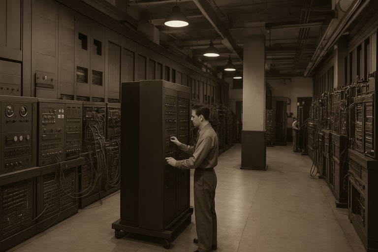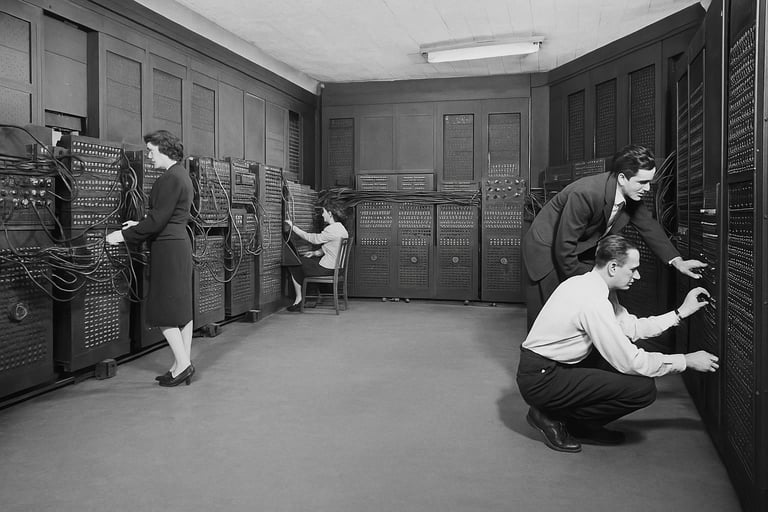 O ENIAC marcou o início da computação moderna, permitindo que cálculos complexos que antes levariam dias ou semanas fossem feitos em minutos. Sua estrutura gigantesca, que ocupava uma sala inteira, incluía milhares de resistores, capacitores e chaves manuais. Apesar de não ter memória programável, podia ser reconfigurado por cabos e interruptores, exigindo habilidades avançadas dos programadores.